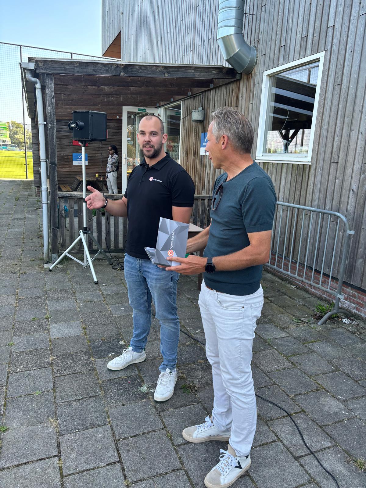 Foto: Accountmanager Kevin Lier van OUXO overhandigt Will Panman een video-impressie van de constructie van de zonnepanelen van vorig jaar. Zie onderstaande video.